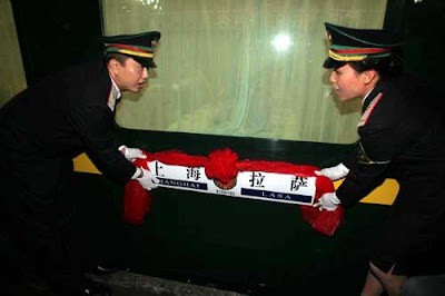 From the website:Zhou Hubin, conductor of the first passenger train from Shanghai to Lhasa, and a steward hang name plate on the train at the Shanghai Railway Station on October 1, 2006. The first passenger train from China's leading metropolis Shanghai to Lhasa, capital of Tibet Autonomous Region, began its 4,373 km journey on Sunday. Carrying 592 passengers, the train, with 15 cars, left Shanghai Railway Station at 4:11 p.m. and is expected to arrive in Lhasa at 7:50 p.m. on Tuesday [2 Octerber].