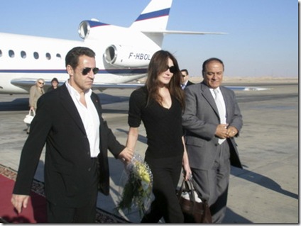 France's President Nicolas Sarkozy (L) officially took his new girlfriend, topmodel-turned-singer Carla Bruni, on a trip to Egypt on the Christmas day December 25, 2007. The hand-in-hand couple shown in the picture above was received by Sameer Farag, head of Luxor's Supreme Local Council of antiquities at Luxor Airport. It was reported that Sarkozy borrowed the private plane from French billionaire Vincent Bollore for the trip. Link #Tags: nicolas sarkozy, girlfriend, carla bruni, vincent bollore