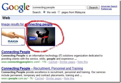 Connecting People is the world's largest handphone manufacturer Nokia's slogan, so occasionally, someone may search this phrase in the most popular search engine, aka Google, on the planet. When the renowned Chinese Google blogger Ken did such a search today, he was totally shocked to find a very NSFW picture as shown here which was automatically provided by Google Universal Search. This incident reminds me of the post named Google Universal Search Means Looking For Raccoons Is No Longer Family Friendly on Search Engine Land.